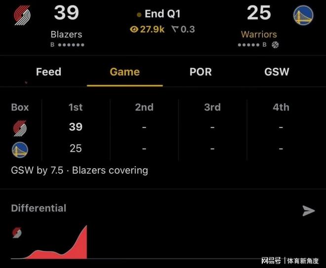 比赛进程颇有些出乎意料。坦诚而言,若非关注对阵双方,仅观比赛节奏之推进,我定会心生疑惑:勇士队何时换上了黑色主场球衣?定睛细看,方知原来是勇士队在首节便被上赛季进攻效率位列末席的开拓者队狂轰近40分……